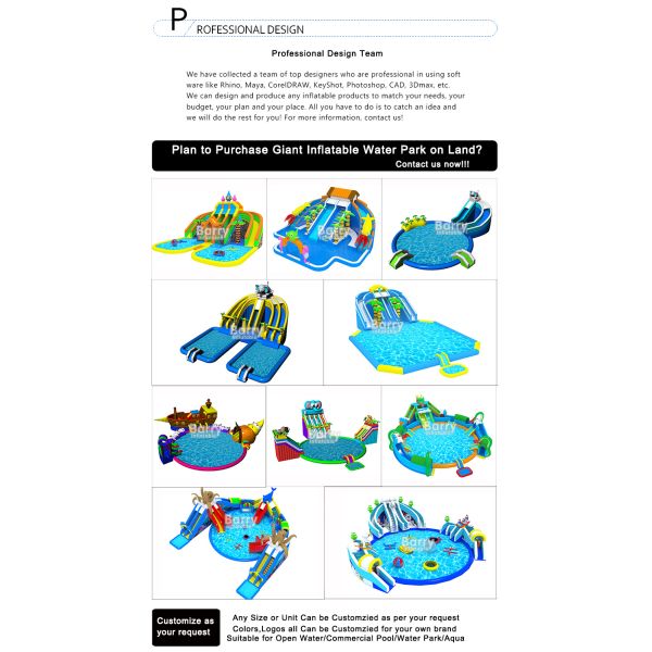 Function: This water park is one of the newest designs from Barry Inflatabls. The size of the pool can be dia. 20m or dia. 30m, which means the pool can contain 30 to 50 kids to enjoy fun and cool in the large poor at the same time. The water park offers excitement to kids when they climb on the top of the slide and ride down to the pool speedily from one of the three slides. Small games in the pool will make the park more funny and popular.